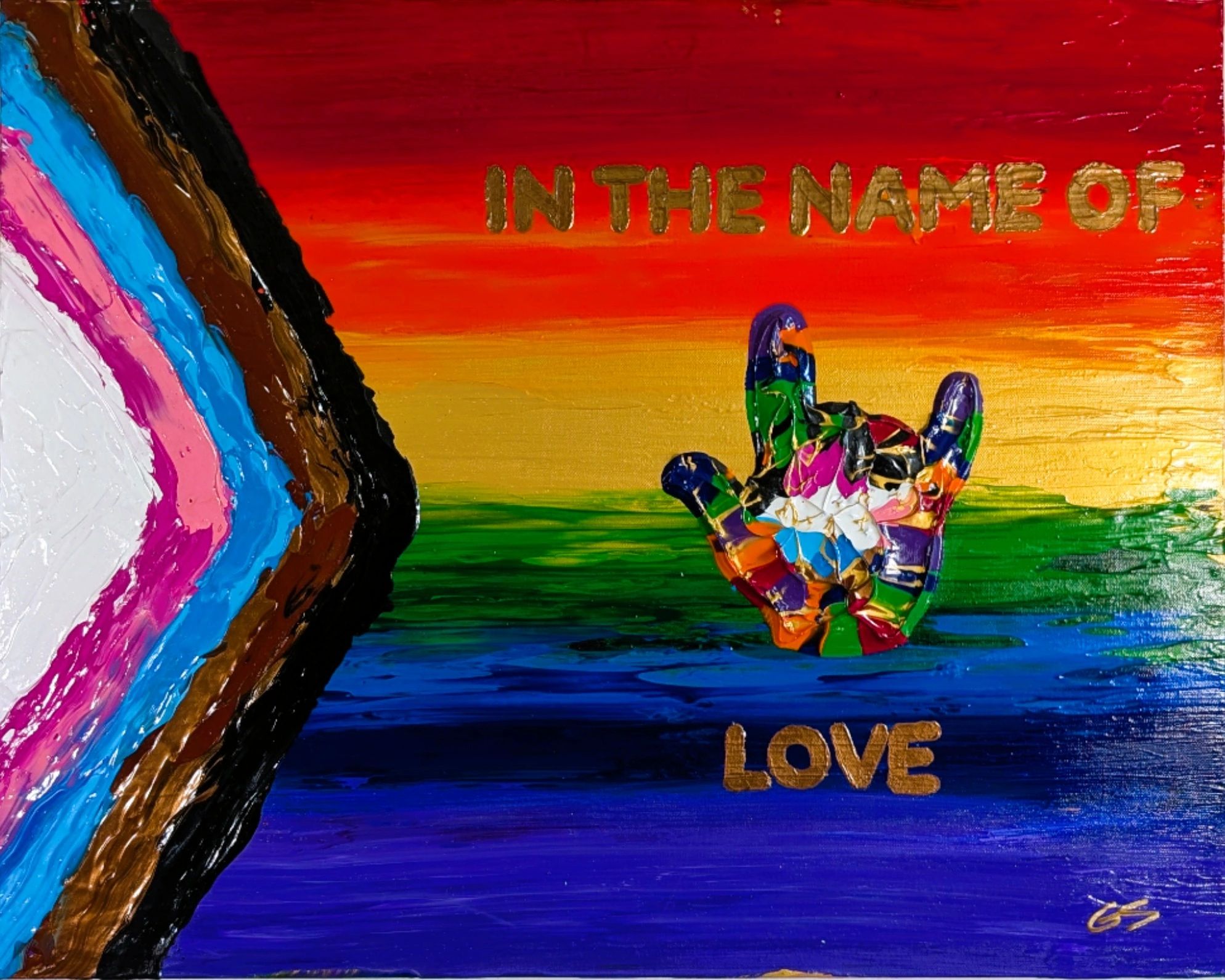 Geoff frequently incorporates the ASL 'I Love You' sign into his paintings, serving as a visual thread that reflects his life with his husband, Andy.